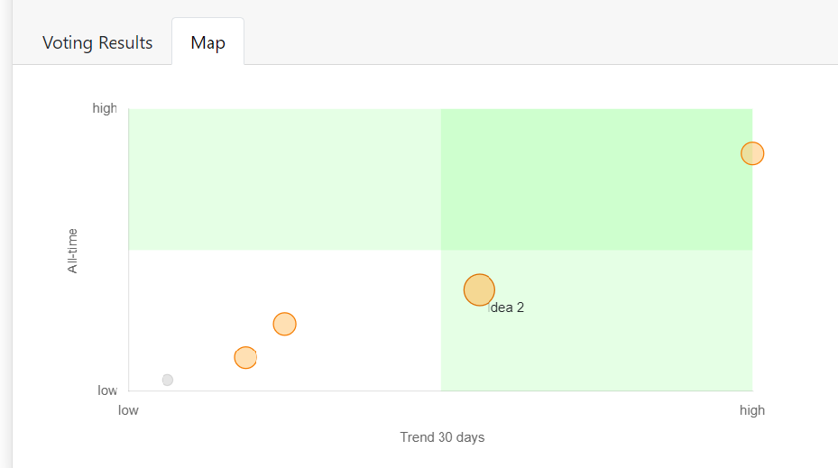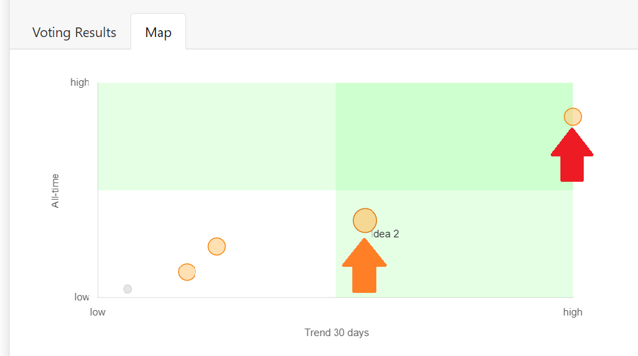 In this chart, the feature voting results are mapped in "trending" vs. "all-time". The owner of a product can identify trending items and also see how they relate to all-time most upvoted items. The owner needs to look at both: