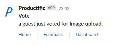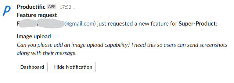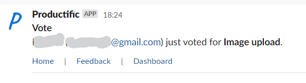 With this Slack app, Productific notifies a Slack channel when new user feedback is created on a product feedback listing. You can receive notifications when your users send any of the following feedback: